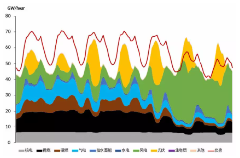 圖6 2021年3月22日至28日每小時(shí)德國發(fā)電電源結(jié)構(gòu)(GW)