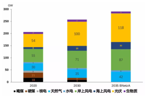 在2021年修訂的可再生能源法案中,德國制定目標(biāo),2030年光伏裝機(jī)要達(dá)到100GW,海上風(fēng)電和岸上風(fēng)電分別達(dá)到20GW和71GW。德國聯(lián)邦網(wǎng)絡(luò)管理局在年初發(fā)布的2035電網(wǎng)規(guī)劃草稿中,預(yù)期煤電完全退出,風(fēng)電和光伏裝機(jī)量繼續(xù)增長(zhǎng),同時(shí)也規(guī)劃了一定的儲(chǔ)能和氫能。
