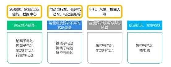 對于儲能效用好,安全性稍好,成本稍高的電池,可以應(yīng)用在對便攜性移動性要求強(qiáng)的應(yīng)用場景,例如汽車、機(jī)器人等;對于儲能效用不那么高、安全性好、成本低的電池,可以應(yīng)用在對空間、便攜性沒有限制的應(yīng)用場景,如5G基站、工業(yè)儲能;對于儲能效用和安全性極高,但是成本也極高的電池,可以應(yīng)用在航空航天領(lǐng)域。
