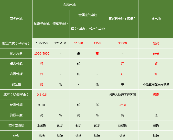 因為新型電池大多尚在研究階段,所以很多需要實踐才能驗證的數(shù)據(jù)缺失(如成本、安全性等),因此在分析他們的應(yīng)用場景時,主要聚焦他們的優(yōu)勢維度上。