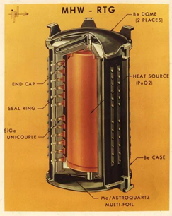 核電池有很多種,都是利用放射性同位素的衰變來發(fā)電(并非反應(yīng)堆),但航天器上用的主要是钚238核熱電池,它的原理很簡單:芯部的钚238衰變產(chǎn)生熱量,通過換能器也就是熱電轉(zhuǎn)換器件,利用溫差將熱能轉(zhuǎn)化為電能,所以也叫同位素溫差電機(jī)RTG。