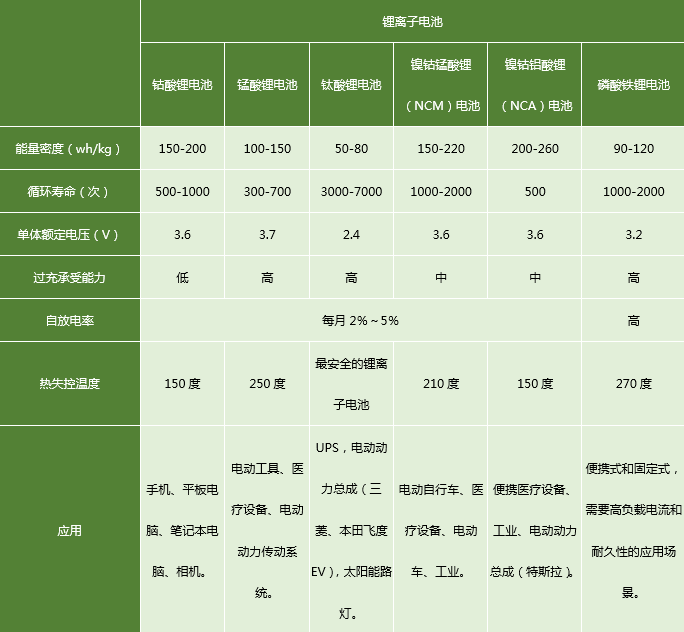 表二:鋰離子電池性能對比