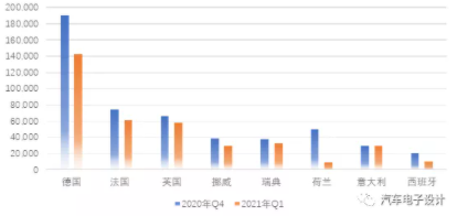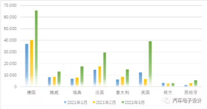 圖2 主要?dú)W洲國家1-3月份的新能源銷量數(shù)據(jù)