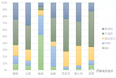 圖5 Q1歐洲主要國家混動(dòng)和新能源汽車之間的對照