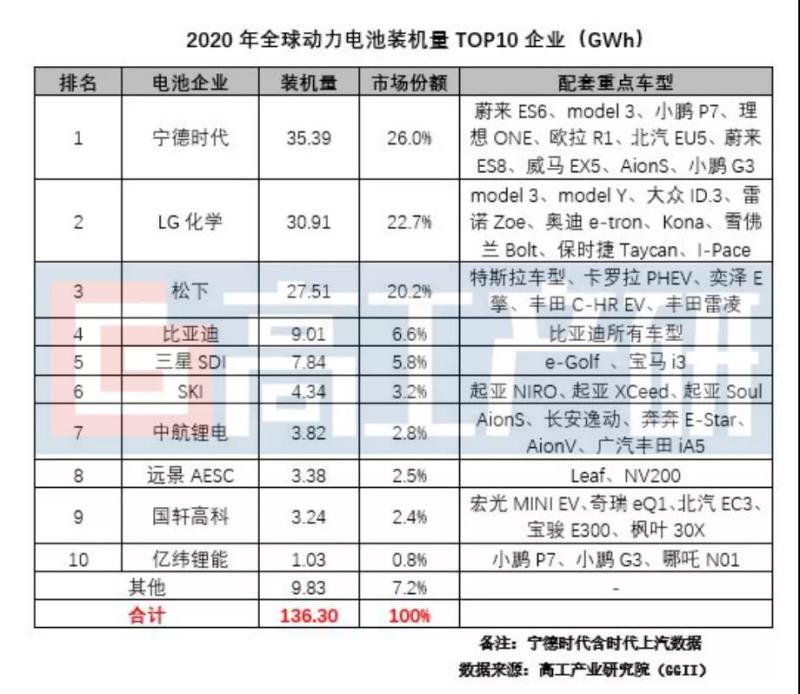 GGII數(shù)據(jù)顯示,2020年全球動力電池裝機量TOP10企業(yè)依次是寧德時代、LG能源、松下、比亞迪、三星SDI、SKI、中航鋰電、遠景AESC、國軒高科和億緯鋰能。