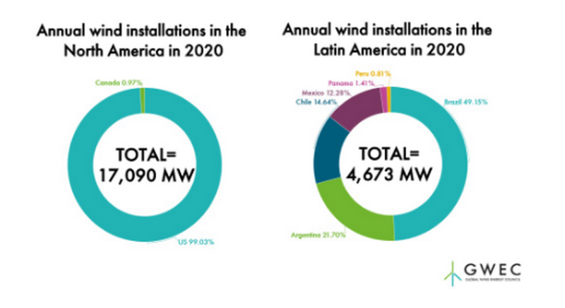 根據(jù)全球風(fēng)能理事會(huì)GWEC市場(chǎng)數(shù)據(jù)顯示,2020年,盡管受到COVID-19的影響,是北美和拉丁美洲風(fēng)電創(chuàng)紀(jì)錄的一年。全年新增風(fēng)電容量約22吉瓦,同比增長(zhǎng)62%。