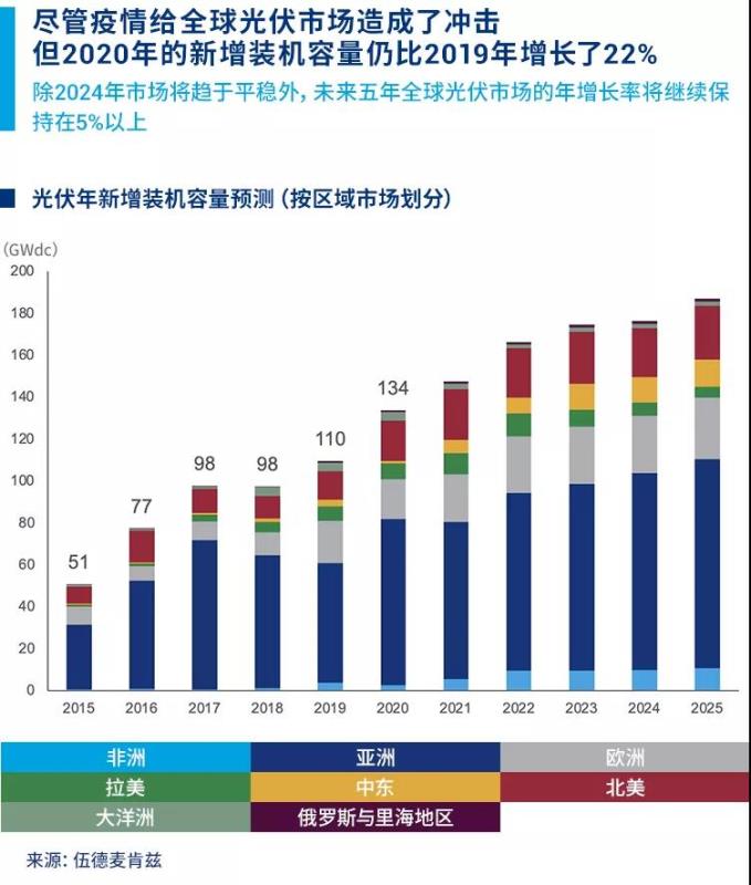 全球光伏市場(chǎng)持續(xù)面臨新冠肺炎疫情帶來的挑戰(zhàn)。2020年全球光伏市場(chǎng)的表現(xiàn)好于預(yù)期,新增裝機(jī)容量達(dá)到134GWdc,較2019年同比增長(zhǎng)22%。幾乎所有國(guó)家都解除了最嚴(yán)格的封鎖措施,目前項(xiàng)目建設(shè)仍得以按計(jì)劃推進(jìn)。預(yù)計(jì)至2025年,光伏市場(chǎng)年度新增裝機(jī)容量都將持續(xù)增長(zhǎng),最高將達(dá)到187GWdc。唯一的例外是2024年,年增長(zhǎng)率低于5%,主要原因在于著美國(guó)投資稅收抵免(ITC)政策延期放緩,本土光伏市場(chǎng)增速也將放緩。
