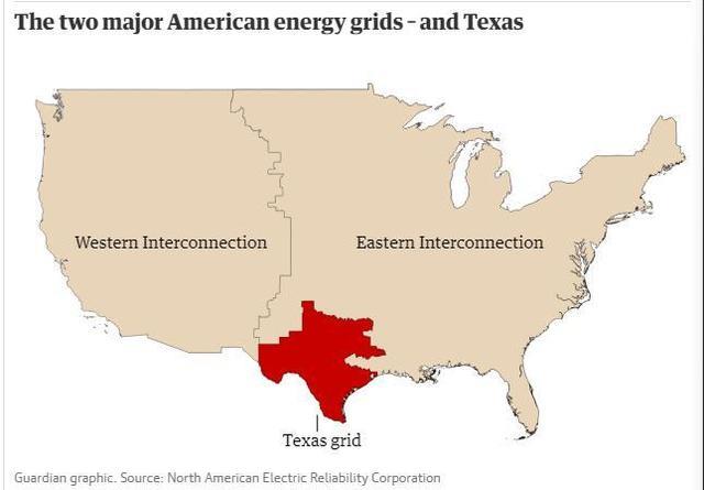 ↑得州電網(wǎng)獨立于東、西電網(wǎng)之外,無外援可用 圖據(jù)《衛(wèi)報》