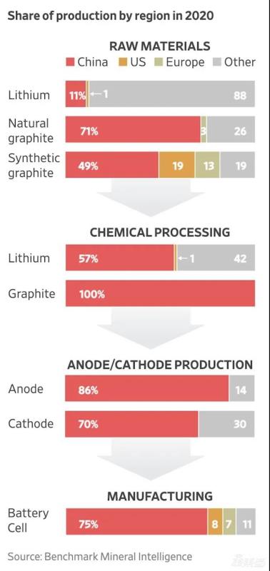 研究機(jī)構(gòu)Benchmark Mineral Intelligence公布的數(shù)據(jù)顯示,全球鋰電池原材料中,70%以上都來源于中國,來自歐洲、美國兩個(gè)地區(qū)的原材料甚少。