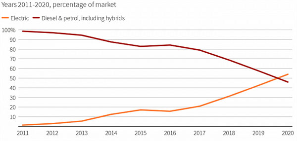 同樣公布2020年國(guó)家汽車(chē)銷(xiāo)量的國(guó)家還有挪威。近日據(jù)挪威公路聯(lián)合會(huì)(OFV)發(fā)布的最新數(shù)據(jù)顯示,2020年該國(guó)電動(dòng)車(chē)銷(xiāo)量占比達(dá)到54.3%,高于2019年的42.1%,成為全世界首個(gè)全年電動(dòng)車(chē)銷(xiāo)量占比過(guò)半的國(guó)家。