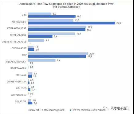 德國算是歐洲最大的單一汽車市場,在政府強(qiáng)力的政策下,2020年光是純電動(dòng)汽車,德國就賣了194,163輛新電動(dòng)汽車(12月為43,671輛)上路,與2019年同比增長206%(2019年才63,281)。如果包含PHEV以后,德國2020年的新能源滲透率已經(jīng)超過了13.5%,這是不同車系的滲透率分布,目前在小型車?yán)锩嬲急冗_(dá)到了29.9%,SUV占比19.9%。