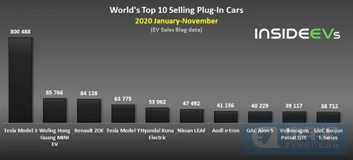 2020年截止到11月全球有超過三分之二的電動(dòng)汽車是純電動(dòng)車型,銷量大約是28.9萬輛,同比增長(zhǎng)125%,市場(chǎng)份額約占4.1%。
