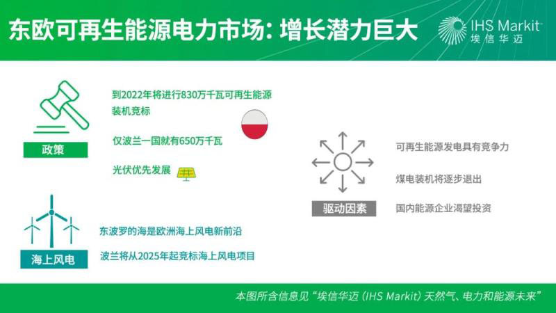 埃信華邁(IHS Markit)預(yù)計(jì),在政府激勵(lì)措施(如招標(biāo))的推動(dòng)下,東歐多個(gè)國(guó)家的可再生能源發(fā)電裝機(jī)都將超出預(yù)期目標(biāo)。預(yù)計(jì)未來(lái)一年半,克羅地亞、匈牙利和波蘭將有約830萬(wàn)千瓦可再生能源項(xiàng)目招標(biāo),其中,波蘭約占650萬(wàn)千瓦。