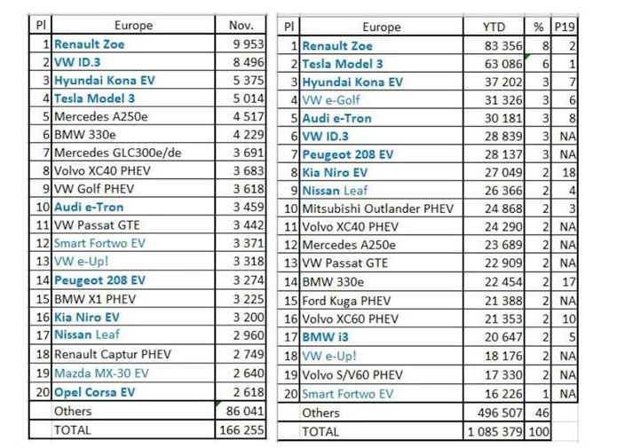 11月,雷諾Zoe、大眾ID.3、現(xiàn)代Kona、特斯拉Model 3、奔馳A級(jí)250占據(jù)了歐洲電動(dòng)車(chē)銷(xiāo)量榜單的前五名,銷(xiāo)量分別是9953臺(tái)、8496臺(tái)、5375臺(tái)、5014臺(tái)、4517臺(tái)。