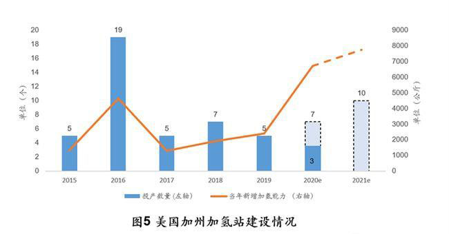 美國(guó)能源部的數(shù)據(jù)顯示,截止2020年11月21日,美國(guó)共建成46座商業(yè)化運(yùn)營(yíng)的加氫站,其中45座位于加利福尼亞州,除Newport Beach以外其余各站均正常運(yùn)營(yíng)。加州預(yù)計(jì)在今年年底前建成7座商業(yè)化加氫站,目前已完成3座,2021年規(guī)劃再建成10座。2018年9月加州燃料電池合作聯(lián)盟(CaFCP)發(fā)布的2030年遠(yuǎn)景規(guī)劃中曾提出,到2030年加州將建成1000座加氫站,目前距離該目標(biāo)還有很大差距。