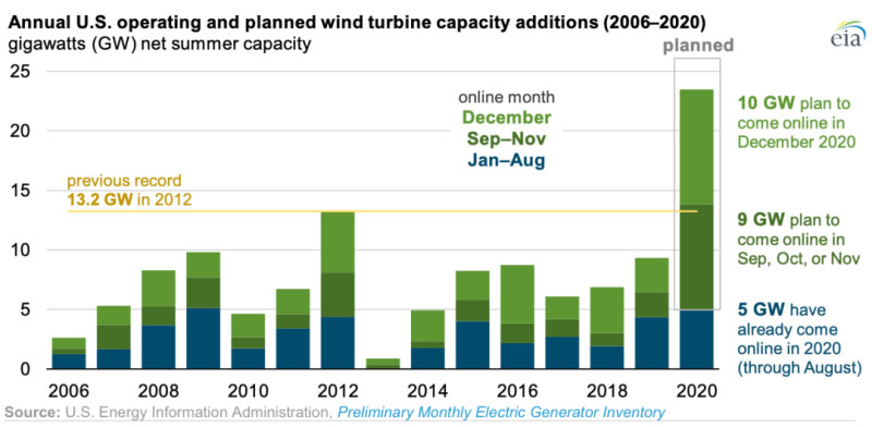 美國對可再生能源的生產(chǎn)稅抵免(PTC)優(yōu)惠在2020年底起逐步取消,這將導(dǎo)致今年的新增風(fēng)電超過平均水平。根據(jù)美國能源信息署(EIA)收集的數(shù)據(jù),預(yù)計(jì)2020年美國有超過23吉瓦(GW)的風(fēng)力渦輪機(jī)發(fā)電容量并網(wǎng),這遠(yuǎn)遠(yuǎn)超過了此前2012年創(chuàng)下的13.2 吉瓦的記錄。今年前8個(gè)月只有5.0GW的容量并網(wǎng),其余18.5GW計(jì)劃在9月至12月并網(wǎng)。在過去的10年中,每年增加的風(fēng)電裝機(jī)量的41%在12月并網(wǎng)。