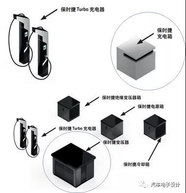 我們之前說過,保時捷為800V的系統(tǒng)推廣設計了一套系統(tǒng),充電箱具有集成的緩沖儲能設備,容許使用最大額定功率為110kW的保時捷,在需要的時候提供高達320kW的充電功率。這個集成的裝置包括電源組件、冷卻組件和集成的儲能電池作為能量緩存Buffer。這個電源里面配置了140kWh電池。保時捷高級充電箱:由一個保時捷變壓器(或者隔離變壓器箱)、一個或多個電源箱以及冷卻箱組成。如下圖所示,可以擴展為不同的系統(tǒng),由于電網(wǎng)對于低電壓的功率有限制,需要使用中壓的電源連接,所以這里設計了帶有集成電隔離的專用保時捷變壓器。
