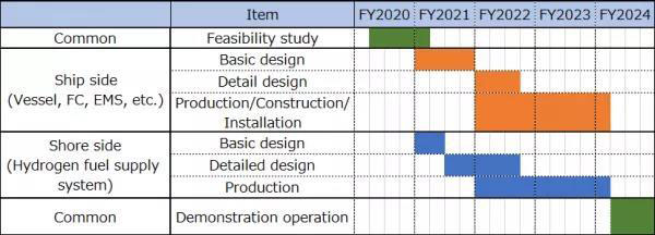 項(xiàng)目的目標(biāo)是共同開發(fā)一艘約150噸級(jí)(即載客量約為100人)的大功率燃料電池船,它將作為一艘中型旅游船使用,并在2024年進(jìn)行示范性的營(yíng)運(yùn)和氫燃料供應(yīng)。具體計(jì)劃是:2020年9月開始燃料電池船以及氫燃料供應(yīng)的可行性研究,2021年開始設(shè)計(jì)船體和氫燃料供應(yīng)設(shè)備,2023年開始實(shí)際建造和生產(chǎn),2024年在橫濱港口海岸試航。