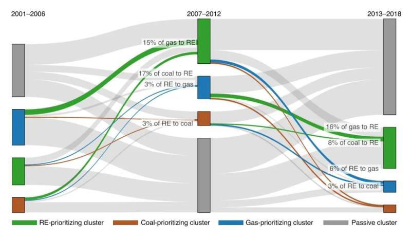 這一研究系統(tǒng)地量化評估了2000年-2018年間全球3000多家電力公司從化石燃料發(fā)電能力向可再生能源的轉(zhuǎn)變,結(jié)果發(fā)現(xiàn)大約75%的公司被歸為“被動型”,其能源結(jié)構(gòu)沒有實質(zhì)性變化。只有10%的公司優(yōu)先考慮可再生能源,但是即便在這10%的范圍內(nèi),許多公司還在繼續(xù)增加新的煤炭和天然氣電源;其余15%的公司優(yōu)先考慮煤炭或天然氣電源。