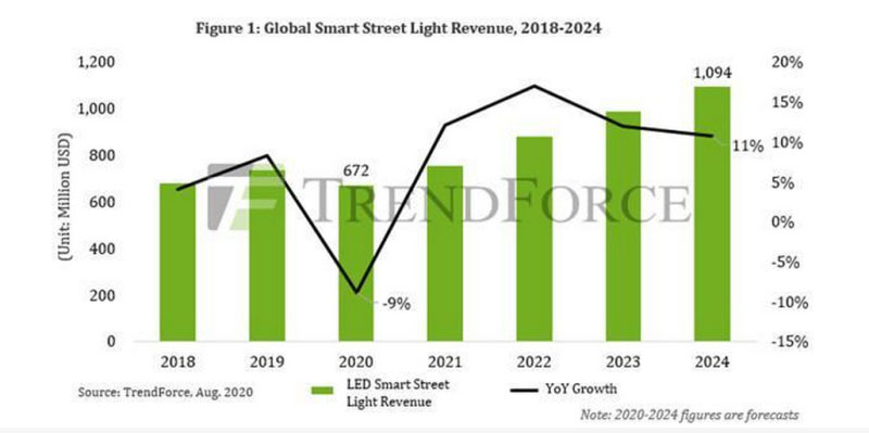 TrendForce在其最新調(diào)查中預(yù)測(cè),全球LED智能路燈市場(chǎng)(僅包括照明器和單個(gè)照明控制系統(tǒng))將迎來(lái)快速發(fā)展,到2024年,將以8.2%的復(fù)合年增長(zhǎng)率增長(zhǎng)。