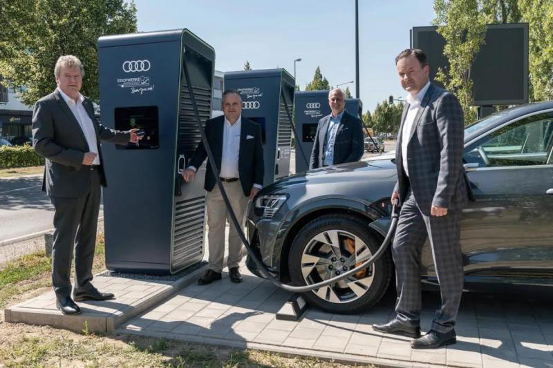 8月4日,奧迪的總部所在地德國英戈爾施塔特市(Ingolstadt)在其城市官網(wǎng)宣布:奧迪聯(lián)合當(dāng)?shù)卣渴鹚膫€高功率充電樁,電動汽車可在幾分鐘內(nèi)充滿電。為了保證這些充電樁的前沿性,這些充電樁的最高輸出功率為300千瓦(kW)。在此,奧迪的 e-tron 55僅需十分鐘,就可以獲得行駛110公里所需的電量。僅需30分鐘左右,就可以進(jìn)行新一次的長途旅行。