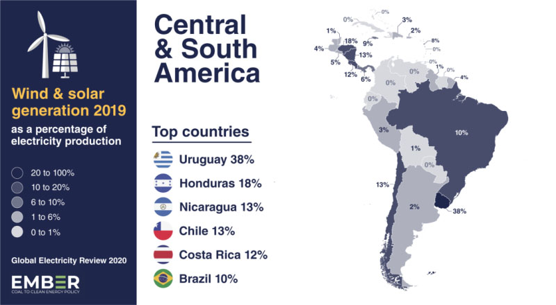 在中南美洲,2019年7%的電力來(lái)自風(fēng)能和太陽(yáng)能。領(lǐng)先的國(guó)家包括烏拉圭(38%)、洪都拉斯(18%)、尼加拉瓜(13%)、智利(13%)和巴西(10%);但哥倫比亞(0%)、委內(nèi)瑞拉(0%)和阿根廷(2%)的份額最低。