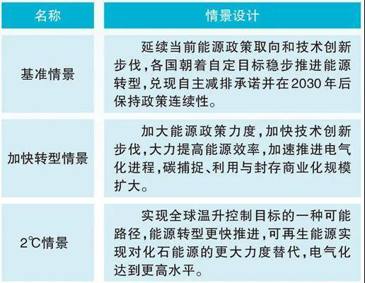 在經(jīng)濟(jì)發(fā)展、人口增長(zhǎng)預(yù)期的基礎(chǔ)上,考慮能源政策、技術(shù)進(jìn)步等方面發(fā)展趨勢(shì),面向2050年設(shè)計(jì)了基準(zhǔn)、加快轉(zhuǎn)型、2℃三個(gè)情景。