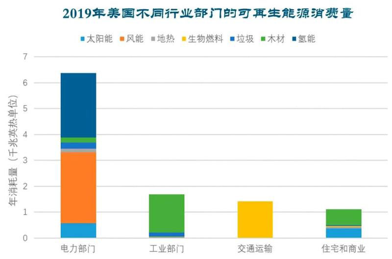 可再生能源也用于工業(yè)(21.7%)、交通(12.2%)、住宅(7.3%)和商業(yè)(2.5%)部門。生物質(zhì),包括木材、生物廢料和生物燃料,在每個(gè)部門都有消費(fèi);木材以及生產(chǎn)生物燃料的副產(chǎn)品主要用于工業(yè)部門;燃料乙醇、生物柴油和可再生柴油等生物燃料主要用于交通部門;木材、廢物垃圾、太陽(yáng)能和地?zé)岫嘤糜谧≌蜕虡I(yè)部門。