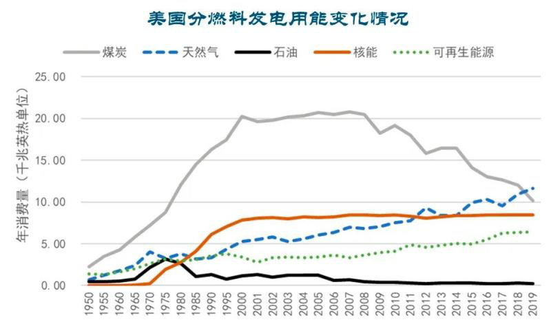 2019年,美國(guó)煤炭消費(fèi)量從2007年的22.7千兆英熱單位降低50%至11.3千兆英熱單位,已接近1964年的用煤量水平。煤炭在美國(guó)一次能源中的占比也由2007年的22.5%降至2019年的11.3%。