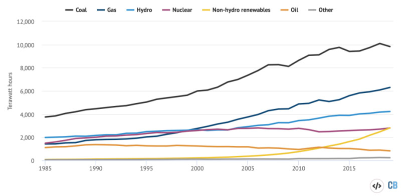 2019年全球煤電為9824TWh,比2018年下降2.6%,但是比2009年增長(zhǎng)21%。非水可再生能源發(fā)電2806TWh,比2018年增長(zhǎng)13.7%,比2009年增長(zhǎng)341%。2019年全球核電為2796TWh,比2018年增長(zhǎng)3.5%,比2009年增長(zhǎng)4%。這是歷史上非水可再生能源發(fā)電首次超過(guò)核電。
