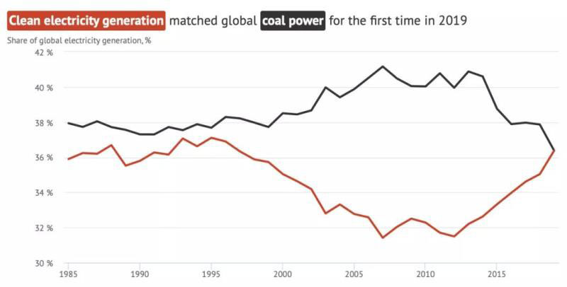 根據(jù)BP最新發(fā)布的世界能源統(tǒng)計(jì),2019年全球煤電占比36.4%;而清潔低碳發(fā)電(可再生能源加核電)也正好占比36.4%,這是歷史是首次清潔低碳能源發(fā)電與煤電相當(dāng)。