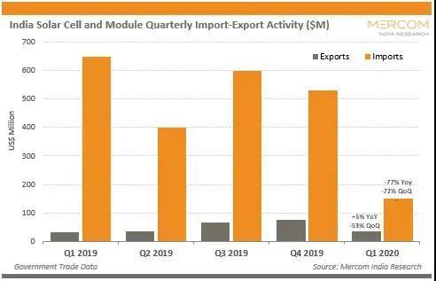 根據(jù)最新的貿(mào)易數(shù)據(jù),2020年一季度,印度太陽能進(jìn)口額同比暴跌77%至1.51億美元,而去年同期為6.5億美元。