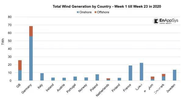 EnAppSys發(fā)布的數(shù)據(jù)顯示,英國超過西班牙成為歐洲第二大風(fēng)電產(chǎn)出國。數(shù)據(jù)考察了2020年前23周(1-5月)的歐洲風(fēng)電水平,發(fā)現(xiàn)英國在此期間僅次于德國排名第二。
