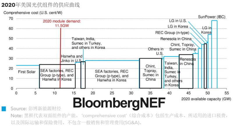BNEF預(yù)計(jì)2020年可供應(yīng)美國(guó)市場(chǎng)的雙面組件產(chǎn)能將達(dá)到20.5GW,其中9.4GW的雙面組件平均生產(chǎn)成本為22美分/瓦。大型廠商今年下半年可將組件生產(chǎn)成本壓低至18美分/瓦。由于普遍性供過(guò)于求,在豁免關(guān)稅的情況下,雙面組件價(jià)格有可能降至23美分/瓦,這個(gè)價(jià)格在涵蓋所有非生產(chǎn)性支出的情況下,可保證4%的凈利潤(rùn)率。
