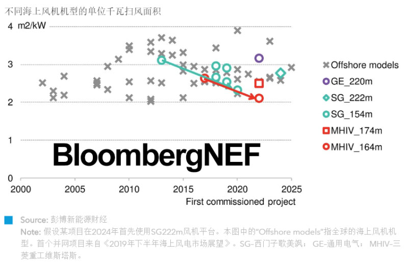 就單位千瓦掃風(fēng)面積的歷史范圍而言,在上述運(yùn)營模式下,我們估計(jì)通用電氣(葉輪直徑220米)和西門子歌美颯(葉輪直徑222米)現(xiàn)有的海上風(fēng)機(jī)平臺可在5年內(nèi)增容至18MW ;三菱重工維斯塔斯的V174m單體容量可提升至11MW。