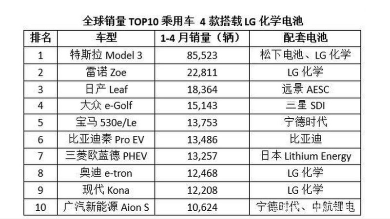 根據(jù)EVsales數(shù)據(jù),今年1-4月,全球銷量TOP10新能源乘用車車型中有4款車型都搭載了LG化學(xué)電池,占比最高。配套熱銷車型,動(dòng)力電池裝機(jī)量自然也跟著快速增長。據(jù)電池中國網(wǎng)了解,僅銷量第一的特斯拉Model 3,今年1-4月就為LG化學(xué)貢獻(xiàn)了1.46GWh的動(dòng)力電池裝機(jī)量。