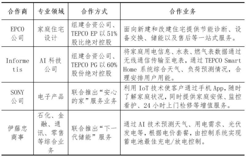 對于商業(yè)發(fā)展前景較好的業(yè)務,東京電力大多與具備技術優(yōu)勢的合作方組建合資公司,開展專業(yè)化運營,東京電力積極爭取控股。由TEPCO EP絕對控股,與家庭住宅設計領域上市公司EPCO組建合資公司,借助EPCO成熟物聯(lián)網平臺和智慧家庭技術,開展住宅節(jié)能診斷、設備交換、儲能以及售后等一站式服務,2018年預計該合資公司銷售額約4.86億元人民幣。由TEPCO PG絕對控股,與科技公司Informetis組建合資公司,依托Informetis基于能源物聯(lián)網的大數(shù)據分析、非入戶式分離技術等,開展家庭用能信息收集、分析、用電方案優(yōu)化業(yè)務,相關數(shù)據同時出售給房產、安保、保險、醫(yī)護服務公司等進行變現(xiàn)。