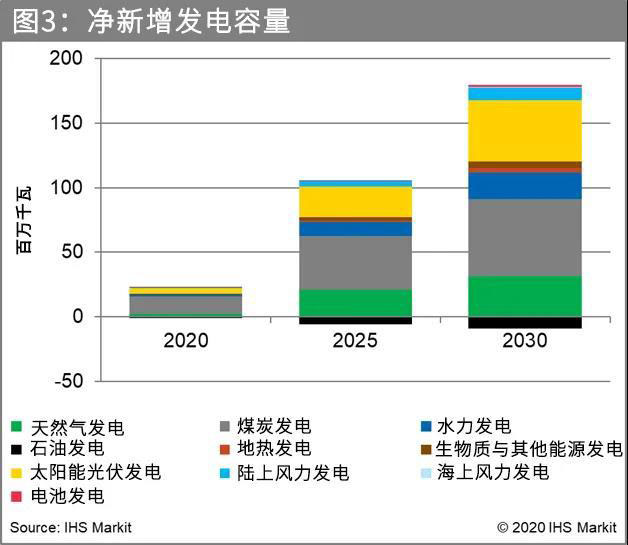 這些已規(guī)劃項(xiàng)目存在一些不確定性。從政府的計(jì)劃和開發(fā)商的項(xiàng)目公告來看,有5000萬千瓦的燃煤發(fā)電和6200萬千瓦的燃?xì)獍l(fā)電項(xiàng)目正在考慮之中。這些項(xiàng)目總計(jì)需要約1400億美元的新投資。隨著燃煤發(fā)電獲得的財(cái)政支持逐漸減少,一些擬議項(xiàng)目可能會(huì)從計(jì)劃中剔除。另一方面,燃?xì)獍l(fā)電項(xiàng)目則始終能獲得資金。它們面臨的主要障礙是如何從國內(nèi)天然氣項(xiàng)目或液化天然氣(LNG)項(xiàng)目獲得天然氣供應(yīng)??紤]到各種制約因素,埃信華邁預(yù)測(cè),到2030年煤炭和燃?xì)獍l(fā)電容量將凈增約9000萬千瓦。