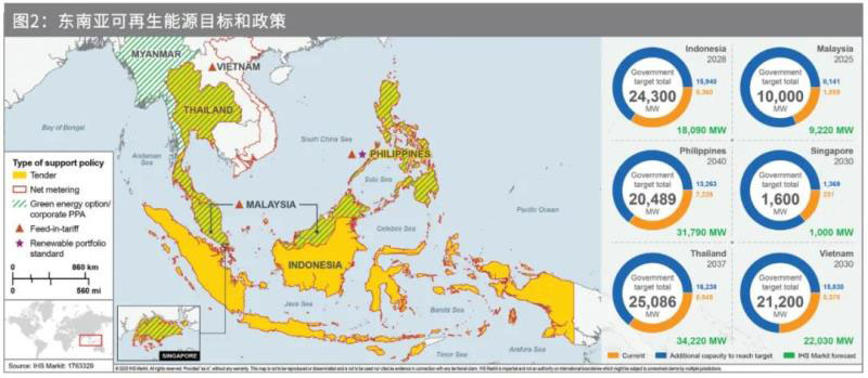 東盟設(shè)定了一個(gè)雄心勃勃的目標(biāo):到2025年,可再生能源在其能源組合中的占比要達(dá)到23%。各個(gè)成員國也設(shè)定了各自的可再生能源目標(biāo)(RET)。這些目標(biāo)大多低于東盟設(shè)定的指標(biāo),但也頗為可觀。過去幾年里,大多數(shù)東盟國家都更新了自己的RET,要么提高目標(biāo),要么將目標(biāo)年份提前。圖2匯總了主要東盟國家的RET以及當(dāng)前裝機(jī)水平。