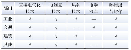 本文考慮可再生能源電氣化的主要技術(shù)路徑如表1所示。其中,直接電氣化包括前面介紹的各種可再生能源電力在終端用能部門的應(yīng)用。