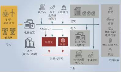 各個部門的電氣化路徑也并非彼此獨立,相反,任何一種技術(shù)路徑都可能對整個能源系統(tǒng)產(chǎn)生深遠的影響,不同部門之間也會因此產(chǎn)生更為緊密的聯(lián)系,進而形成相互耦合、相互影響的綜合能源系統(tǒng)。例如,電制氫及相關(guān)技術(shù)可為間接的可再生能源電氣化提供支撐,特別是對電氣化困難較大的行業(yè)產(chǎn)生重要影響,使終端用能部門的深度脫碳成為可能,如圖2所示。