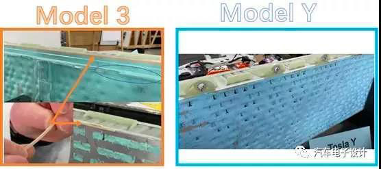 2)導(dǎo)熱結(jié)構(gòu)膠 Model Y的導(dǎo)熱結(jié)構(gòu)膠為淺藍(lán)色,從總的使用來(lái)看用量要比Model 3的少不少,使得ModelY可以清晰的看到模組內(nèi)電芯的空洞,這在Model 3上面是沒(méi)見(jiàn)到的。這個(gè)能減重增加系統(tǒng)的能量密度并且減低成本,膠水的配方和供應(yīng)商不知道切換沒(méi)有。
