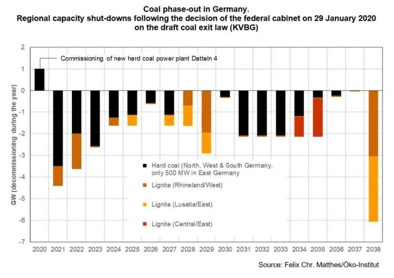 2020年1月聯(lián)邦政府宣布已與受退煤影響州的煤炭經(jīng)營者和州長達(dá)成協(xié)議。與褐煤運(yùn)營商RWE,LEAG(EPH),Uniper和EnBW簽訂的合同將會(huì)包括各褐煤廠的關(guān)閉安排。退煤將在德國西部開始,以減輕對(duì)經(jīng)濟(jì)較弱的德國東部礦區(qū)的影響。從2021年到2022年年底,RWE只負(fù)責(zé)關(guān)閉并將去除萊茵河煤礦區(qū)的近3GW煤電產(chǎn)能。