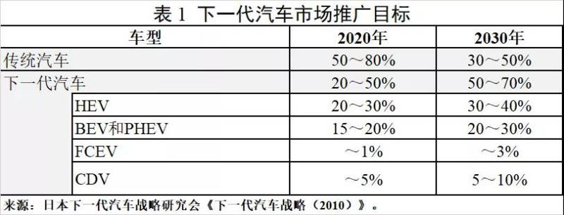 為降低汽車CO2排放并加強日本汽車工業(yè)的技術(shù)能力和競爭力,日本內(nèi)閣于2008年7月發(fā)布《創(chuàng)建低碳社會的行動計劃》,明確“下一代汽車”包括普通混合動力汽車(HEV)、純電動汽車(BEV)、插電式混合動力汽車(PHEV)、燃料電池汽車(FCEV)、清潔柴油汽車(CDV)、天然氣汽車(NGV)等車型,并提出力爭到2020年,下一代汽車在新車銷量中的占比達50%。2010年發(fā)布的《下一代汽車戰(zhàn)略(2010)》是對該文件的進一步細化和落實。