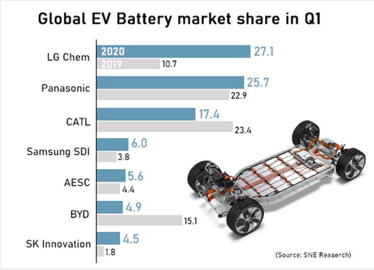 中國儲(chǔ)能網(wǎng)訊:近日,調(diào)研機(jī)構(gòu)SNE Research的最新報(bào)告顯示,2020年第一季度全球電動(dòng)車(EV)電池的使用量中,LG化學(xué)以27.1%的市場(chǎng)占有率排名第一。