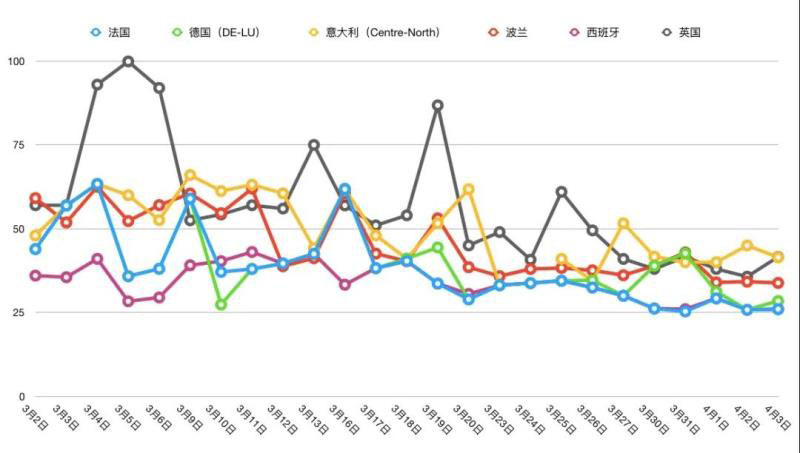 專注于經(jīng)濟學研究的歐洲獨立智庫布魯蓋爾(Bruegel)比較了歐洲六個國家的用電負荷,與2019年相比下降趨勢明顯,如圖1所示。3月23日以后上述六個國家的工作日用電負荷均低于去年同期。