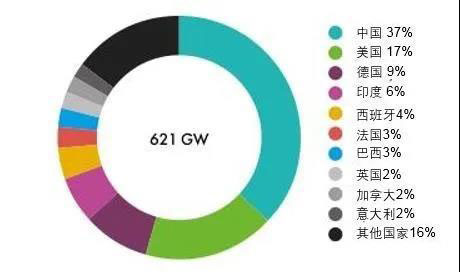 截至2019年底,全球陸上風(fēng)電累計(jì)裝機(jī)容量達(dá)到621 GW,位列前五位的國(guó)家分別為中國(guó)、美國(guó)、德國(guó)、印度和西班牙,共占全球市場(chǎng)的73%。