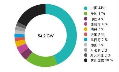 2019年,全球陸上風(fēng)電新增裝機(jī)容量為54.2 GW,排在前五名的國(guó)家分別為中國(guó)(23.8 GW)、美國(guó)(9.1 GW)、印度(2.4 GW)、西班牙(2.3 GW)和瑞典(1.6 GW),其他國(guó)家占比28%。