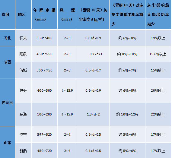 備注:0<d<0.7g/㎡時(shí)候,減少率從0迅速增加為7.4%;當(dāng)1g/㎡<d時(shí),減少率逐漸趨緩;d達(dá)到4g/㎡時(shí),減少率增加到12.2%;當(dāng)d>4g/㎡時(shí),輸出功率減小率趨勢(shì)更緩。
