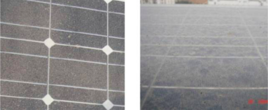 隨著光伏上網(wǎng)電價(jià)的大幅下降,沙塵和工業(yè)污染對(duì)于光伏電站收益率的影響不斷增大,在個(gè)別地區(qū)甚至已成為制約光伏電站建設(shè)開發(fā)的核心因素。表格1是“領(lǐng)跑者”基地灰塵對(duì)于光伏電站輸出電量的影響情況,可以看到,如果缺少必要防塵的措施,電站收益將“損失慘重”,特別是在內(nèi)蒙古烏海地區(qū),由于當(dāng)?shù)毓I(yè)污染嚴(yán)重,很容易產(chǎn)生類似“板結(jié)”的現(xiàn)象,專業(yè)解釋為“粘結(jié)積灰”(見下圖)。這類污染粘性和硬度很大,自然力量難以清除,需要較大的人為外力清除,這不僅影響電站發(fā)電量,還會(huì)增加電站運(yùn)維成本。因此,越來越多的電站開發(fā)商開始選擇帶有SSG自清潔膜層的光伏組件,來保證電站收益率。
